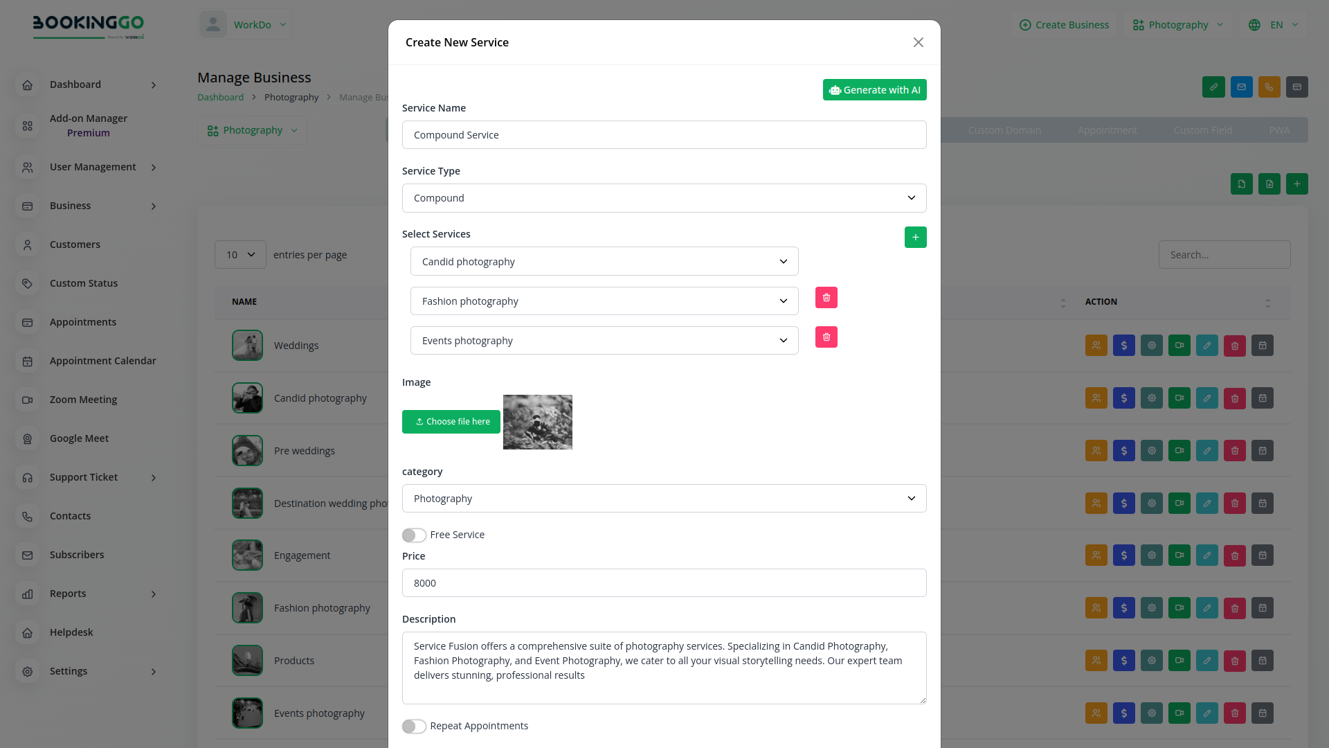 Imagine offering a luxurious weekend getaway package that includes a stay at your charming bed and breakfast, a couples massage, a gourmet dinner reservation, and complimentary bicycles for exploring the picturesque countryside. Traditionally, this would require customers to book each element separately, leading to a fragmented and time-consuming process. BookingGo's Compound Service Module allows you to create a single, cohesive package listing that showcases all the included services. Customers can effortlessly book the entire package in one go, with clear information about each service, pricing, and availability. This not only simplifies the booking process for your customers but also enhances their overall experience, leaving them feeling valued and ready for a relaxing getaway.
