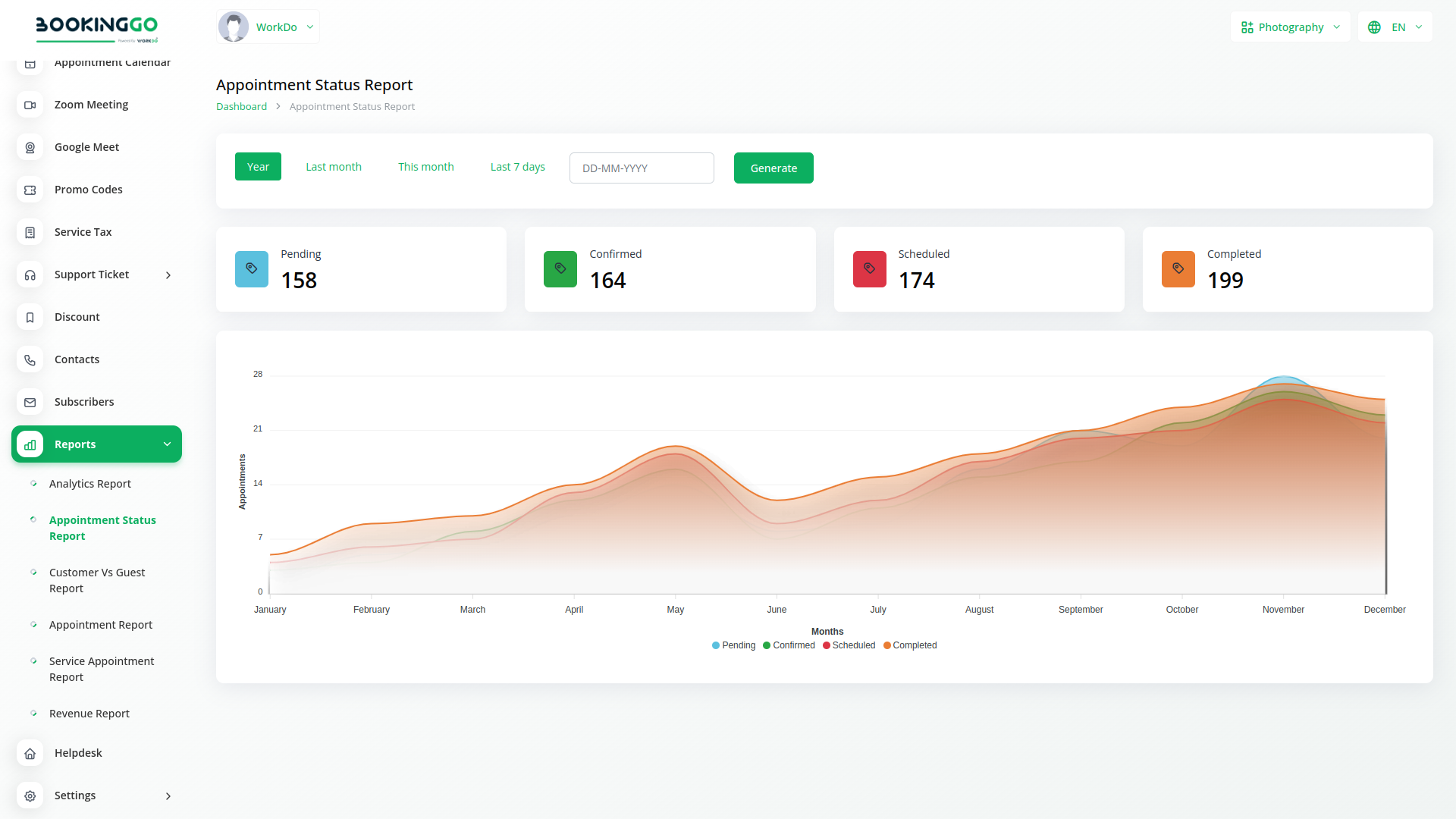 The Appointment Status Report is a critical feature of the Reports module, offering a clear overview of the status of all appointments. This report helps you track which appointments are confirmed, pending, completed, or canceled. By having a real-time view of appointment statuses, you can efficiently manage your schedule, reduce no-shows, and improve overall appointment management. This report is essential for maintaining a smooth operational flow and ensuring that your services are delivered as planned.